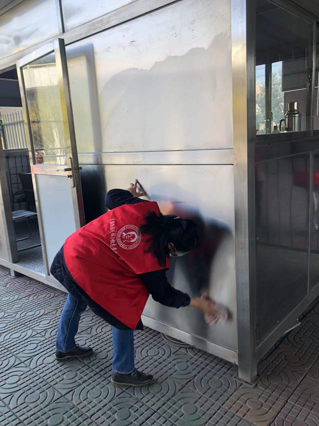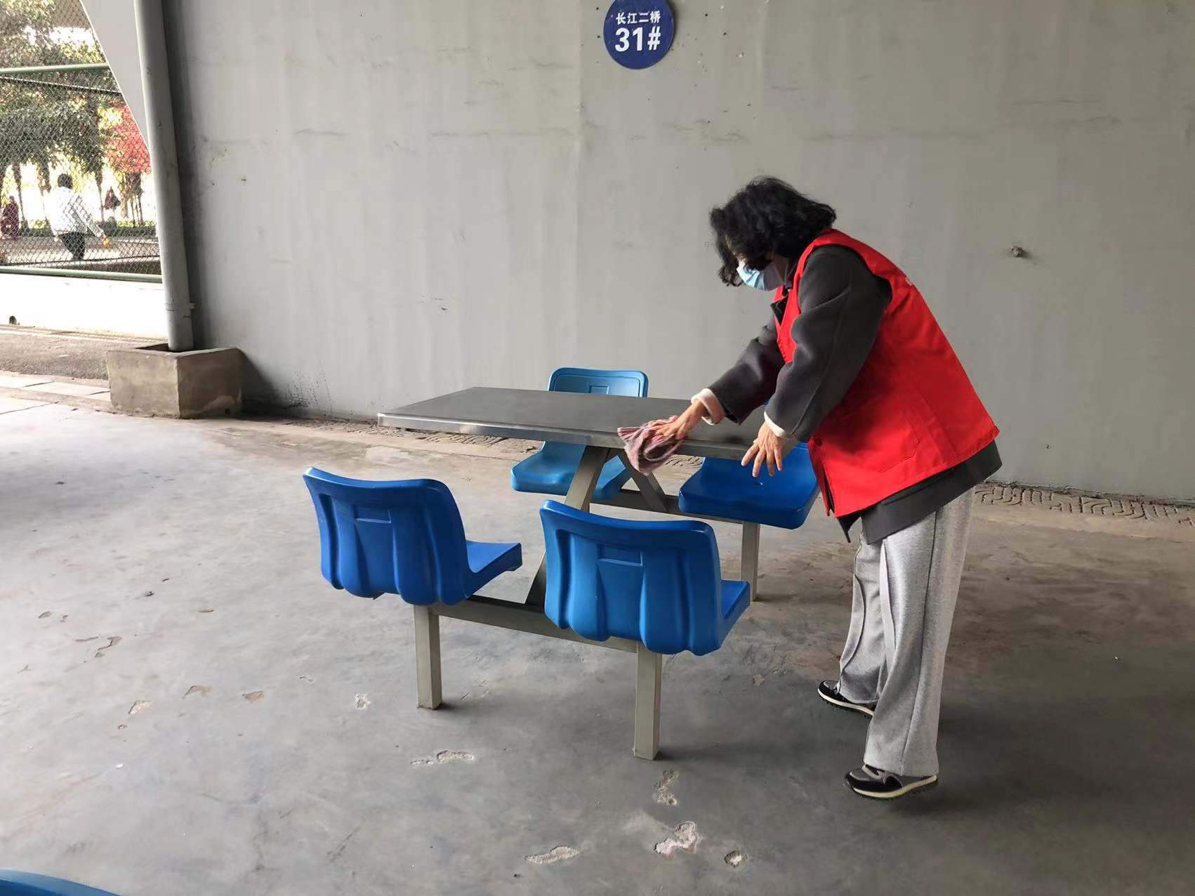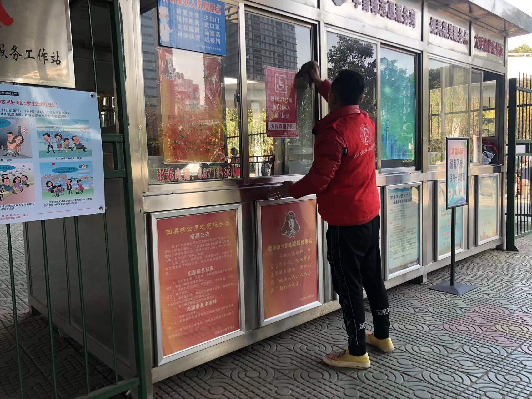 服务内容:12月11日,四美塘公园组织志愿者擦洗公共阅报点桌椅、栏杆等,开展清洁家园活动。
